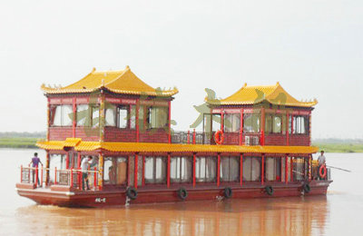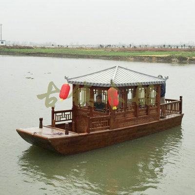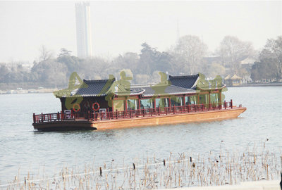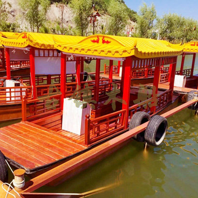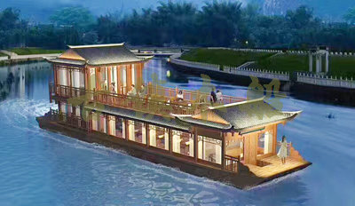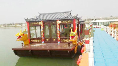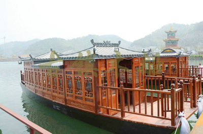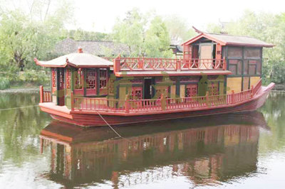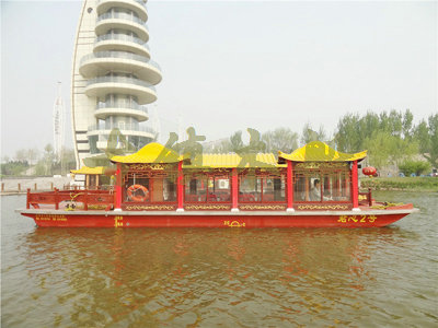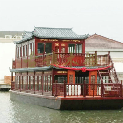 畫舫船就是裝飾古典華麗的游船,是"中國風"的仿古游船,結合古典園林建筑,體現(xiàn)了中華文明的古典藝術.畫舫船豪華而又古典,船上的建筑按照中國古代建筑里的亭臺樓閣,建筑工藝之復雜,要求之嚴格,仿古畫舫游船的特點飛檐翹角、玲瓏精致的四角亭子逐漸成形,赫然立于船頭,美人靠、盤龍柱子、彩畫……龍柱上的浮雕盤龍和祥云一層扣著一層,層層錯落有致,雕刻精細到盤龍身上的每一個鱗片都細細可數,古代皇家標志性元素,在畫舫船上體現(xiàn)的淋漓盡致。除了雕刻、花窗,整條船還有一個看點,那就是弧線優(yōu)美、高高翹起的船尾。游船并不大,長約10米、寬3米,但是整體看起來堪稱一件藝術品。船尾的雕花欄桿與船艙、船頭的雕刻遙相呼應,船身四周貼著浮雕祥云,給整條船增添了富貴、華麗的氣質。